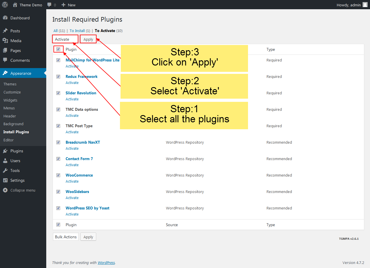 1. After theme install, Just click the link to Begin installing plugins.