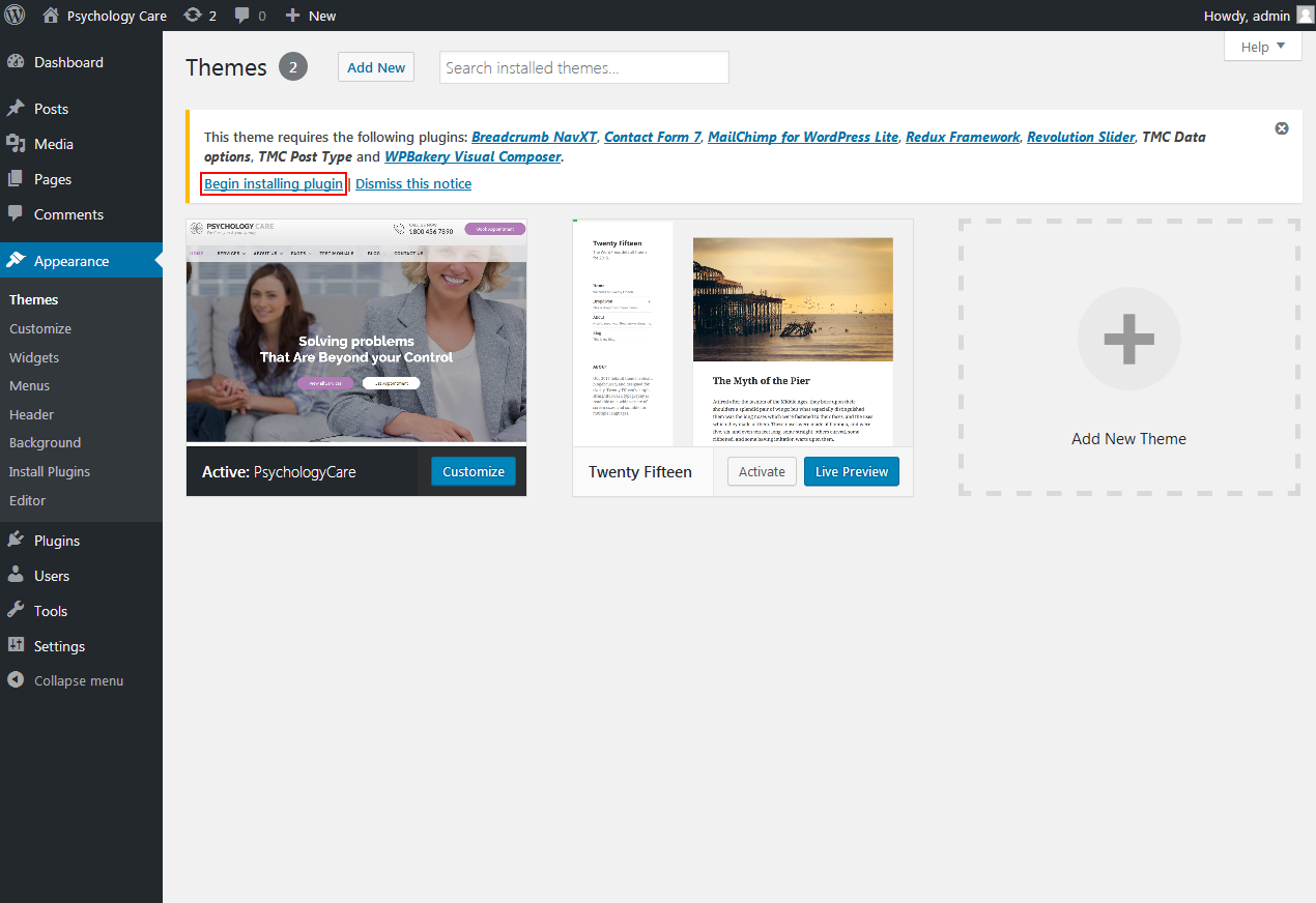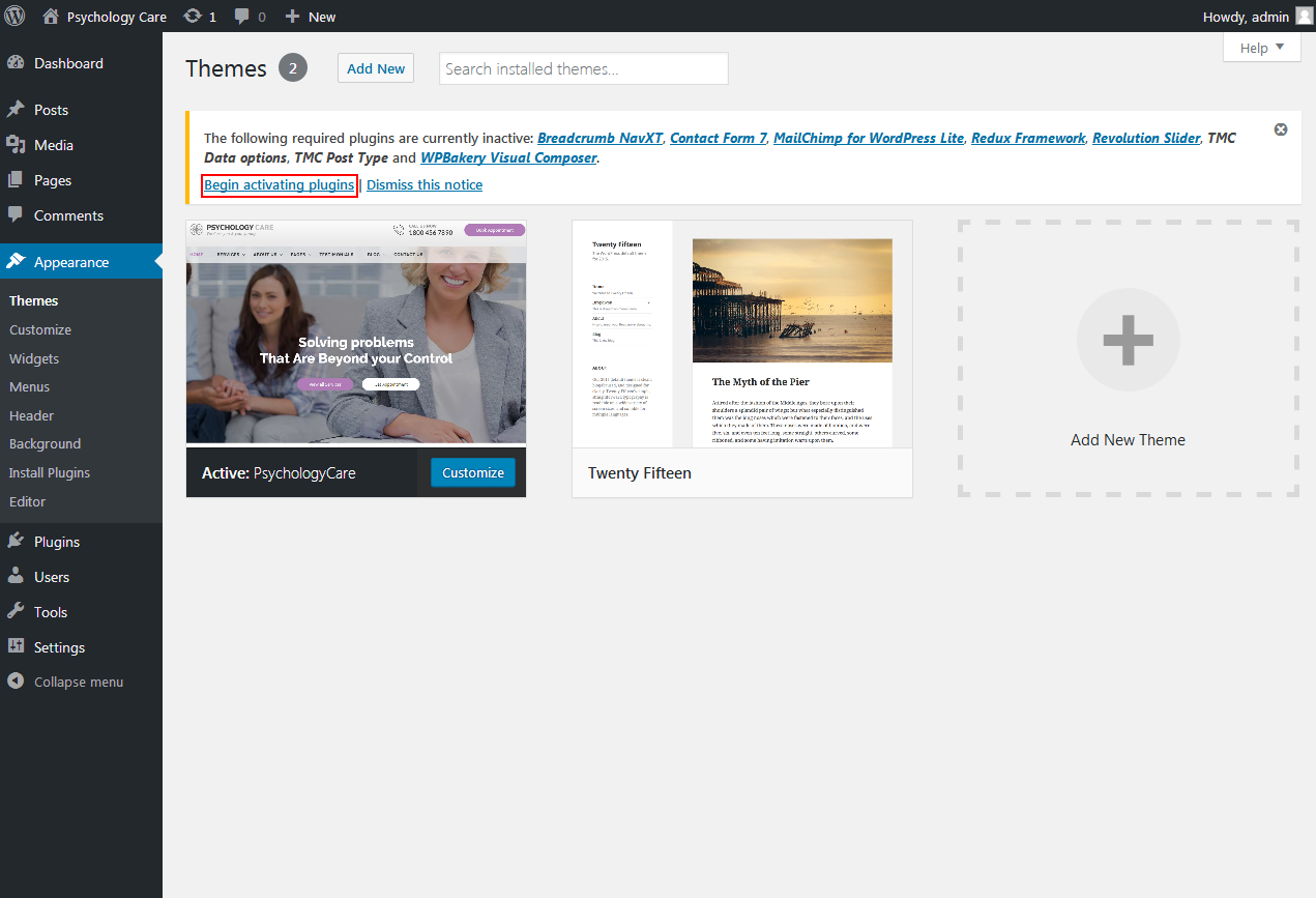 3. Once you have installed and activated our theme you will be prompted to install required and recommended plugins. Just click the link to Begin activating plugins.