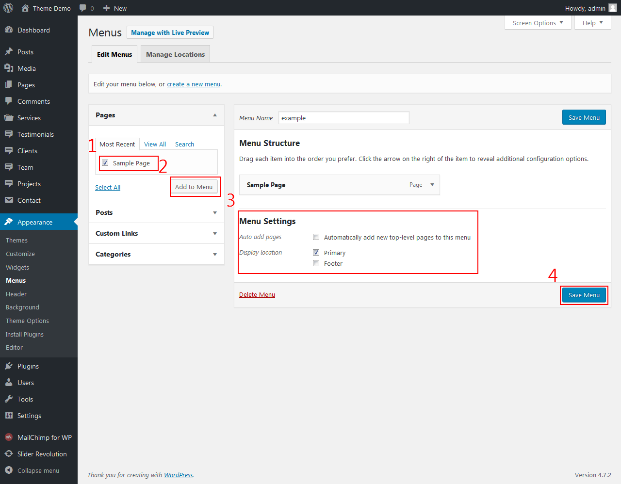 The theme offer two Menu locations: Primary and Footer