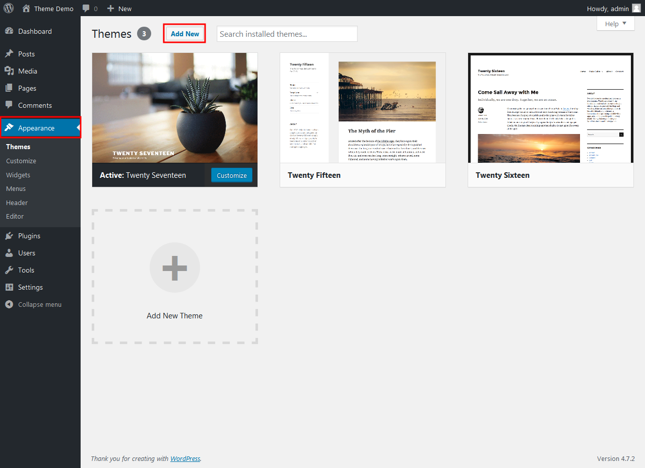 Step 1: Go to Appearance -> Themes then click to Add New